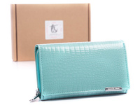 Lakierowany portfel damski zapinany na zamek z paskiem na rękę turkusowy RFID
