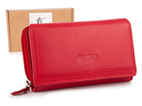 Duży poziomy portfel damski czerwony szyty ręcznie ze skóry naturalnej w kwiaty RFID